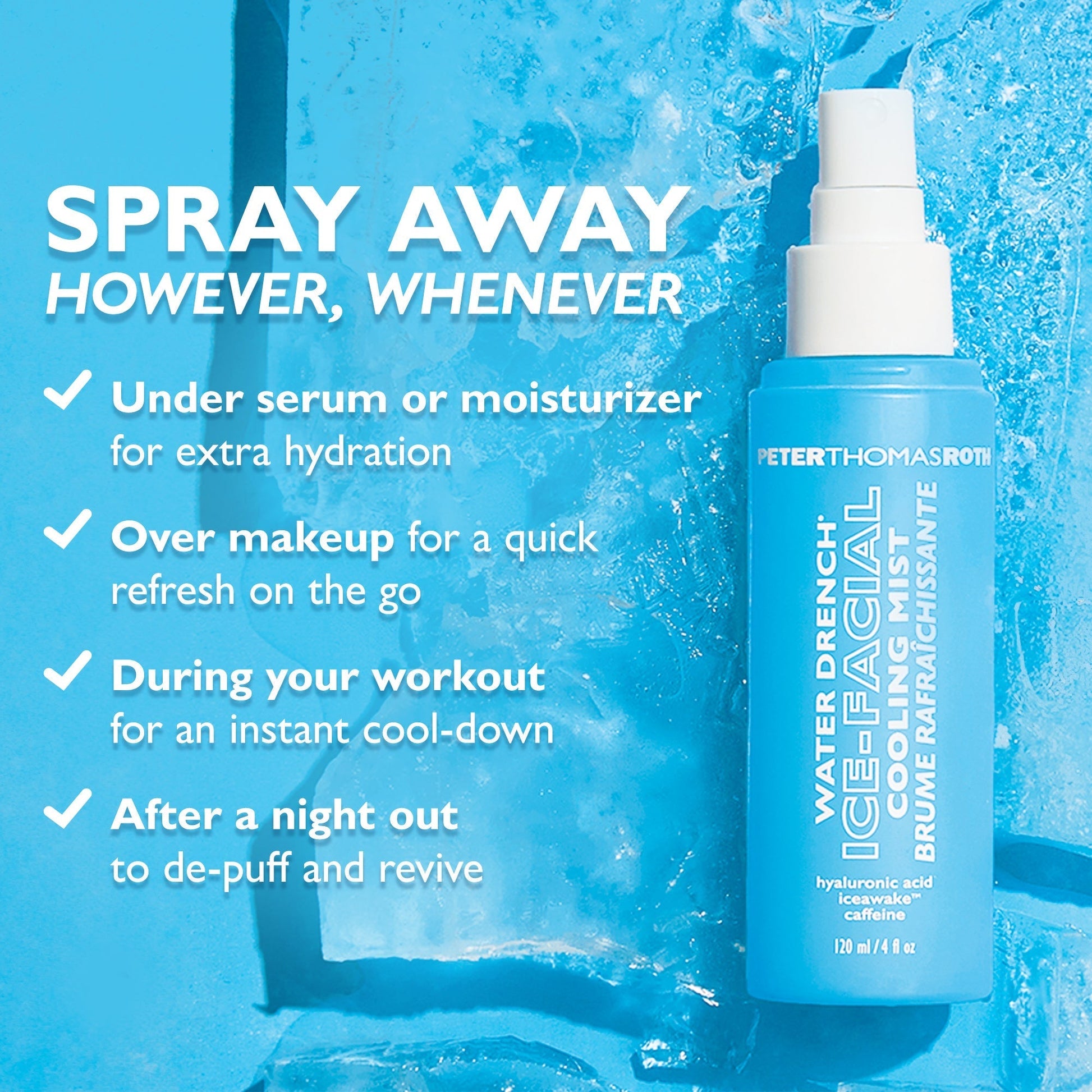 This spray-on ice facial instantly revives the look of dry, puffy skin and is clinically proven to immediately decrease skin temperature.* Infused with Hyaluronic Acid, IceAwake™ Activating Technology, Caffeine and Peppermint, this light and refreshing mist hydrates, cools and de-puffs the look of tired skin affected by external stressors or a poor night’s rest. Green, Red and White Teas help calm the look of redness. Ophthalmologist-tested.